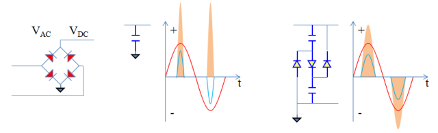 ★假设VAC为220V,VDC稳定在200V,那么无逐流电路时,只有VAC>200V,二极管才导通,有逐流电路时,VAC>100V,二极管就导通。