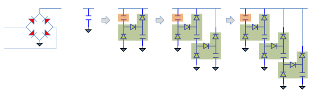 ●从前面的分析可以看到,逐流电路是通过二极管环向,使得电容是串联充电,并联放电,串联时数量为2,因此充放电区间的电压落差为2倍。