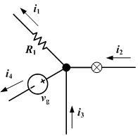 所有进入节点的电流的总和等于所有离开这节点的电流的总和。对于本图案例,i1 + i4 = i2 + i3 。