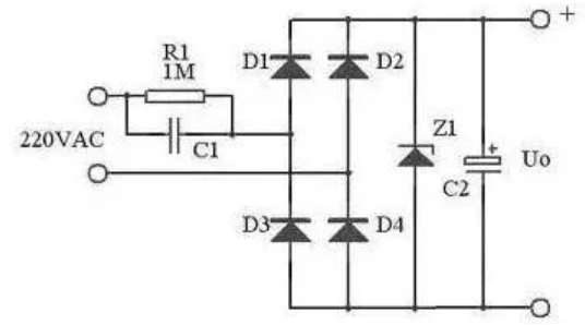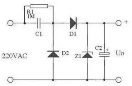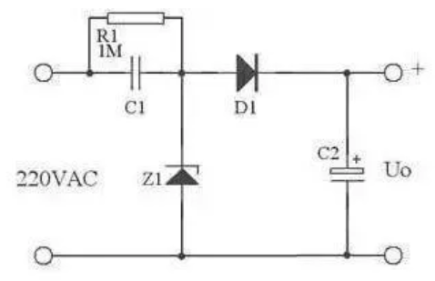 图1为阻容降压的典型应用,C1为降压电容,R1为断开电源时C1的泄放电阻,D1为半波整流二极管;D2在市电的负半周为C1提供放电回路,否则电容C1充满电就不工作了,Z1为稳压二极管,C2为滤波电容。输出为稳压二极管Z1的稳定电压值。
