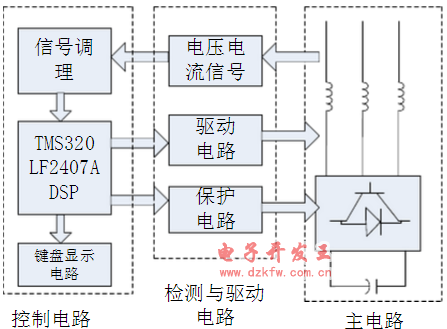 配电网静态同步补偿器(DSTATCOM)系统总体硬件结构框图如图2-1所示。由图2-1可知DSTATCOM的系统硬件大致可以分成三部分,即主电路部分、控制电路部分、以及介于主电路和控制电路之间的检测与驱动电路。其中采样电路包括3路交流电压、6路交流电流、2路直流电压和2路直流电流、电网电压同步信号。3路交流电压采样电路即采样电网三相电压信号;6路交流电流采样电路分别为电网侧三相电流和补偿侧三相电流的电流采样信号;2路直流电压和2路直流电流的采样电路DSTATCOM的桥式换流电路的直流侧电压信号和电流信号;电网电压同步信号采样电路即电网电压同步信号。