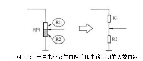 音量电位器在电路中相当于电阻的一个分压电路,图1-3为音量电位器与电阻分压电路之间的等效电路图,其中RP1为音量电位器。