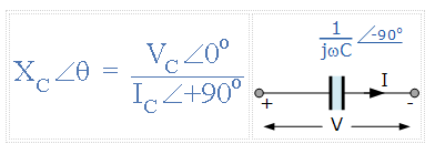其中: I C = V /(1 /ωC)(或 I C = V / X C )是电流幅度,θ= + 90 o 是相位差或电压和电流之间的相角。对于纯电容电路, Ic 导致 Vc 90 o ,或 Vc 滞后 Ic