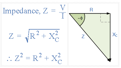 然而当电阻器和电容器在同一电路中连接在一起,总阻抗的相位角介于0 o 和90 o 之间,具体取决于所用元件的值。然后通过使用阻抗三角形可以找到上面所示的简单RC电路的阻抗。