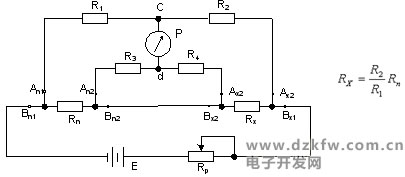 R1-R4为桥臂电阻,阻值很小,一般不超过0。5Ω。如果能在制造电桥时,使R2=R3,R1=R4并精心同步调整,满足R2R3=R1R4则被测电阻为