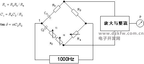 1)测量电容时,桥体连接成图下图所示的串联电容电桥(维恩电桥)。被测的电容接在1/2两端,Cx为被测电容的容量,Rx是他的灯效串联电阻。调节桥臂中可调电阻使电桥平衡,此时,根据电桥的平衡条件:ZxZ4=Z2Z3可导出