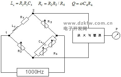 2)测量电感时,桥体连接成如下图所示(麦克斯威电桥)。被测电感接在1、2两端,LX是它的电感量,RX是它的等效串联损耗电阻。当电桥平衡时有