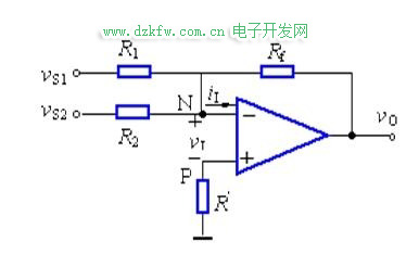反相端输入电流ii=0的概念,通过r2与r1的电流之和等于通过rf的电流故(vs1–v-)/r1+(vs2–v-)/r2=(v-–vo)/rf…………b.