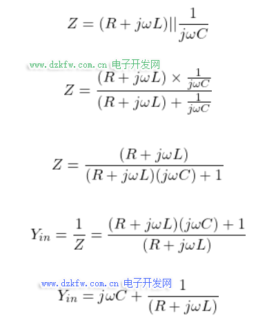 考虑到电阻(R)和电感器(L)是串联的。这种组合与电容器(C)并行。因此,阻抗为: