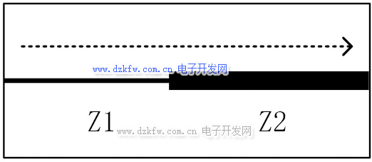 如下图所示,对于传输线而言,当信号从左向右传播时,如果走线突然加粗,那么对应的单位长度电感和电位长度电容就会发生变化,使得阻抗突变,Z1≠Z2,阻抗突变会引起信号反射。