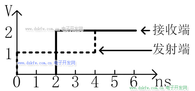 我们还是假如在传输线的延迟是2ns,假如信号源刚加载到传输线时A点的电压为1V。