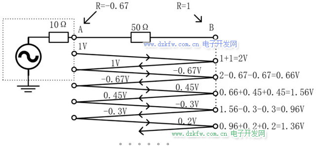 再经过2ns后,1V反射电压到达A点,在A又发生反射,A点的反射电压是1*(-0.67)=-0.67V,向B传播。