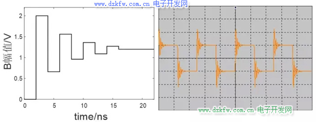 我们根据上面的分析过程画出B点的波形,见下左图,可以看到信号的震荡过程,那么如果在源端做到阻抗匹配的话,B端的电压升到2V就会稳定下来停止震荡,现在A端没有做阻抗匹配,那么信号就会来回反射,产生振铃。下面右图是实测某信号的振铃波形。