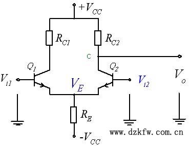 B极因R1和R2得到一个固定的偏压。 共模输入时,Vi1=Vi2,因IE为不变,IC1和IC2也不能改变,故Vo为零,而共模信号被抑制。 差动输入时,Vi1=-Vi2,虽然IE为不变,但IC1和IC2也可改变,因IC1上升而IC2下降,