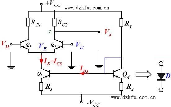 当差动讯号输入时,Vi1 = -Vi2,IC1增加而IC2减少,总电流IE = IC1 + IC2便不变,
