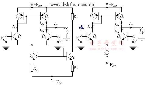 实际上,RE不能加得太大,因会使静态之IC1和IC2减少,使Q1和Q2得不到适当 之偏压或需要很高之电源电压。 上图Q3及Q4为电流镜像恒流源代替电阻RE,使用恒流源可以得到高阻抗及固定电流,