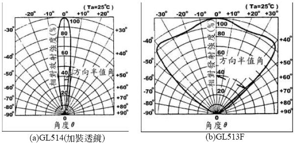越小即代表元件之指向性越灵敏。一般使用红外线发光二极管均附有透镜,使其指