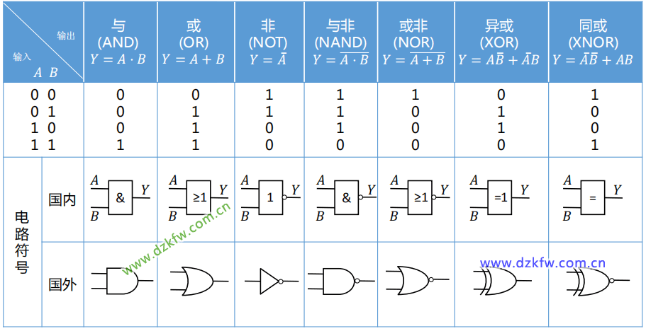 5. 同或门:逻辑符号为“⊙”,表示当两个输入相同时输出为1,不同时输出为0。