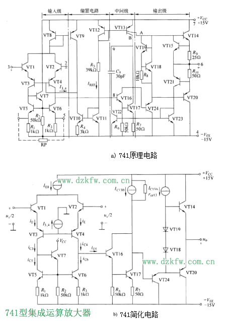 VT12和VT13构成双端输出的镜像电流源。VT12是一个双集电极的横向PNP型晶体管,可视为两个晶体管,它们的两个基-集结彼此并联。一路输出为VT13A集电极,使IC16+IC17=IC13B,主要作为中间放大级的有源负载;另一种输出为VT13A的集电极,供给输出级的偏置电流,使VT14、VT20工作在甲乙类放大状态。