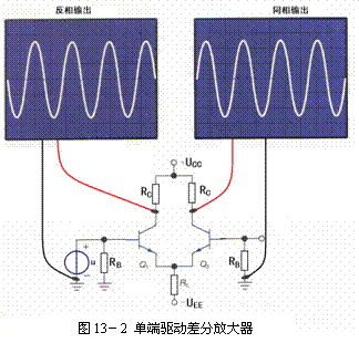 如图13-2,信号加在差分放大器两个输入端中的一个 ,信号能从两个集电极输出。假设正向变化的输入信号加到Q1的基极,因为它是NPN的三极管,Q1的导电性增加。因为Q1电流增加,降在Q1集电极电阻RC上的电压也增加。使得Q1的集电极电位下降。因此Q1集电极得到反相输出。