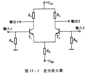 差分放大器响应两个输入信号之差,它有两个输入端。图13-1是差分放大器的基本电路,通常采用双电源偏置,图中-UEE电源使发射结正偏,+UCC使集电极反偏。
