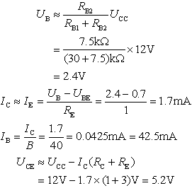 【例2】共发射极基本放大电路如图所示,已知UCC=12V ,RC =3KΩ,RL=3KΩ,RA=24KΩ晶体管的β=40 。
