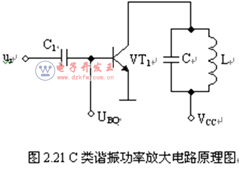 用LC并联回路取代电阻Rc,所组成的电路称为C类LC谐振功率放大电路。它由三极管VT1、LC并联谐振回路、输入信号耦合电容C1、基极偏置电压UBQ和集电极偏置电压VCC组成。