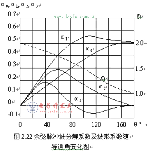 曲线g1表示基波分量与直流分量比值Ic1m/Ic0随导通角变化的情况