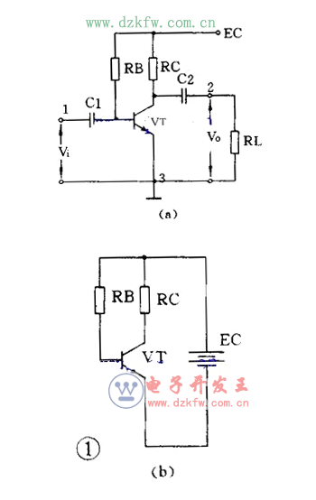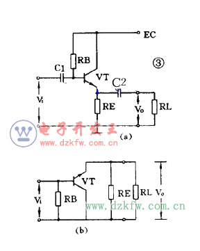 图 3 ( a )是一个射极输出器。它的输出电压是从射极输出的。图 3 ( b )是它的交流通路图,可以看到它是共集电极放大电路。