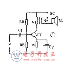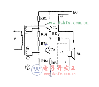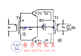 图 6 是常用的乙类推挽功率放大电路。它由两个特性相同的晶体管组成对称电路,在没有输入信号时,每个管子都处于截止状态,静态电流几乎是零,只有在有信号输入时管子才导通,这种状态称为乙类工作状态。当输入信号是正弦波时,正半周时 VT1 导通 VT2 截止,负半周时 VT2 导通 VT1 截止。两个管子交替出现的电流在输出变压器中合成,使负载上得到纯正的正弦波。这种两管交替工作的形式叫做推挽电路。