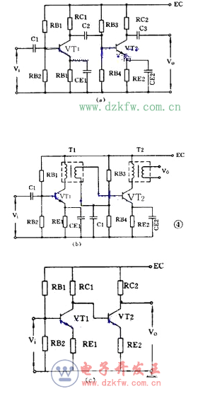 一个放大器通常有好几级,级与级之间的联系就称为耦合。放大器的级间耦合方式有三种: ①RC 耦合,见图 4 ( a )。优点是简单、成本低。但性能不是最佳。 ② 变压器耦合,见图 4 ( b )。优点是阻抗匹配好、输出功率和效率高,但变压器制作比较麻烦。 ③ 直接耦合,见图 4 ( c )。优点是频带宽,可作直流放大器使用,但前后级工作有牵制,稳定性差,设计制作较麻烦。