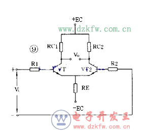 解决零点漂移的办法是采用差分放大器,图 9 是应用较广的射极耦合差分放大器。它使用双电源,其中 VT1 和 VT2 的特性相同,两组电阻数值也相同, R E 有负反馈作用。实际上这是一个桥形电路,两个 R C 和两个管子是四个桥臂,输出电压 V 0 从电桥的对角线上取出。没有输入信号时,因为 RC1=RC2 和两管特性相同,所以电桥是平衡的,输出是零。由于是接成桥形,零点漂移也很小。