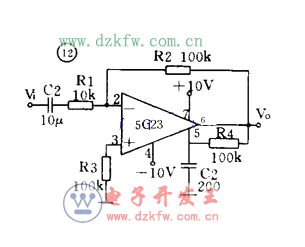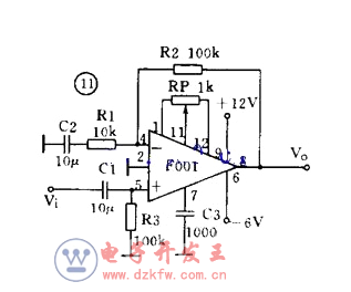图 11 是带调零端的同相输出运放电路。引脚 1 、 11 、 12 是调零端,调整 RP 可使输出端( 8 )在静态时输出电压为零。 9 、 6 两脚分别接正、负电源。输入信号接到同相输入端( 5 ),因此输出信号和输入信号同相。放大器负反馈经反馈电阻 R2 接到反相输入端( 4 )。同相输入接法的电压放大倍数总是大于 1 的。