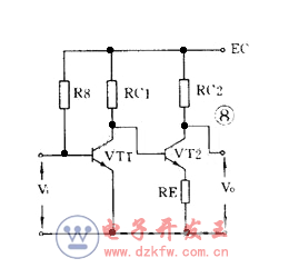 直流放大器不能用 RC 耦合或变压器耦合,只能用直接耦合方式。图 8 是一个两级直耦放大器。直耦方式会带来前后级工作点的相互牵制,电路中在 VT2 的发射极加电阻 R E 以提高后级发射极电位来解决前后级的牵制。直流放大器的另一个更重要的问题是零点漂移。所谓零点漂移是指放大器在没有输入信号时,由于工作点不稳定引起静态电位缓慢地变化,这种变化被逐级放大,使输出端产生虚假信号。放大器级数越多,零点漂移越严重。所以这种双管直耦放大器只能用于要求不高的场合。