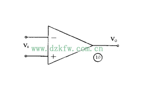 集成运算放大器是一种把多级直流放大器做在一个集成片上,只要在外部接少量元件就能完成各种功能的器件。因为它早期是用在模拟计算机中做加法器、乘法器用的,所以叫做运算放大器。它有十多个引脚,一般都用有 3 个端子的三角形符号表示,如图 10 。它有两个输入端、 1 个输出端,上面那个输入端叫做反相输入端,用“ — ”作标记;下面的叫同相输入端,用“+”作标记。