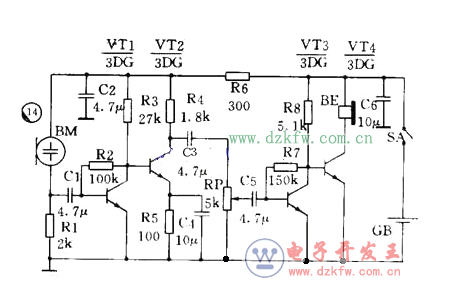 图 14 是一个助听器电路,实际上是一个 4 级低频放大器。 VT1 、 VT2 之间和 VT3 、 VT4 之间采用直接耦合方式, VT2 和 VT3 之间则用 RC 耦合。为了改善音质, VT1 和 VT3 的本级有并联电压负反馈( R2 和 R7 )。由于使用高阻抗的耳机,所以可以把耳机直接接在 VT4 的集电极回路内。 R6 、 C2 是去耦电路, C6 是电源滤波电容。