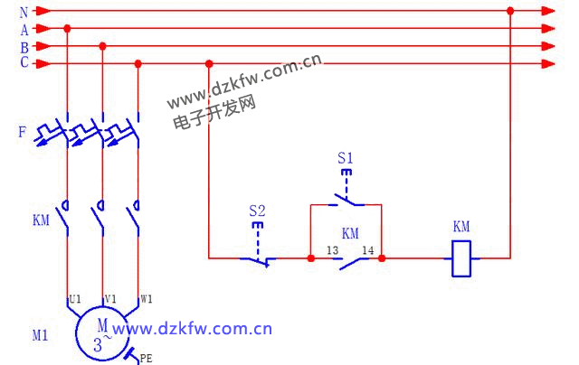 左图的控制电路,接触器线圈串联了自身的常开辅助触点和停止按钮S2。启动按钮S1按下后,接触器线圈得电,同时辅助触点动作闭合,此刻,即使松开按钮S1,线圈也是一直通电的,它的主触点也就一直闭合,电机一直得电运行。直到按下停止按钮S2后,接触器线圈断电,所有触点恢复常态(常开),电机停止。