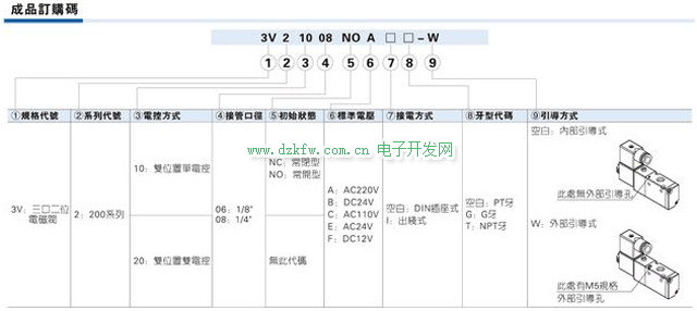 另外,在产品样本手册上,还有包括电控方式、电压、接电方式、先导控制方式等参数,下面贴出一份亚德客某一型号的订购代码,供参考,这里不做过多说明。