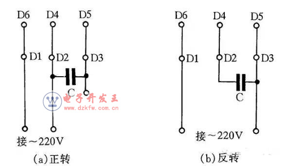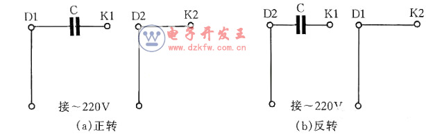 图4是JX07A-4型单相电容运转电动机接线方法。电动机功率为60W,用220V/50Hz交流电源、电流为0.5A。它的转速为每分钟1400转。电容选用耐压400~500V、容量8μF的产品。图4(a)为正转接线,图4(b)为反转接线。