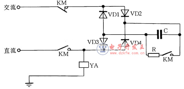 直流电磁铁停电后,因有剩磁存在,有时会造成不良后果。因此,必须设法消除剩磁。图9中,YA是直流电磁铁线圈,KM是控制YA启停的接触器。KM吸合时,YA通电励磁;KM复位时,YA断直流电,并进行快速退磁。