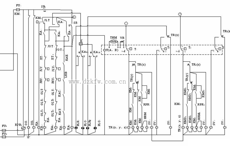 JHYl,2为高压压力保护继电器,JLYl,2为低压压力继电器。当冷凝器中冷却水中断,螺杆压缩机出口高压超过被设定的压力时,JHYl,2常闭触点断开,使两台压缩机停止运行(JHYl,2阻断压力为22kgf/cm2,接通压力为16kgf/cm2),防止超高压而引起事故。当压缩机吸气压力减小到预置压力以下(预置阻断压力为2.5kgf/cm2,接通压力为5kgf/cm2)时,JLYl,2常闭触点断开,JZ11及JZ21继圈断电,也使两台压缩机停止工作。
