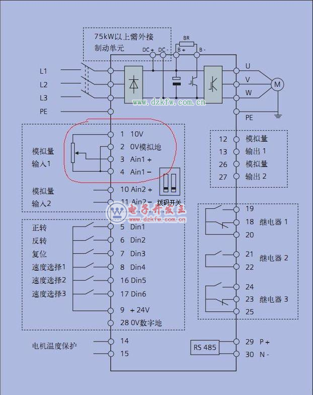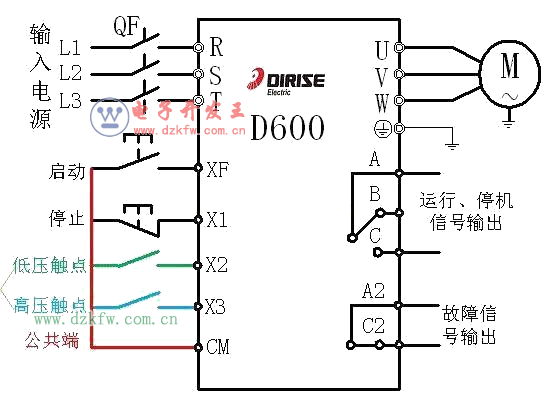 开关量液位调节浮球有出线三根:公共线,高限位线,低限位线。需要对应的接入变频器输入信号侧的开关量接入端口,接线图举例: