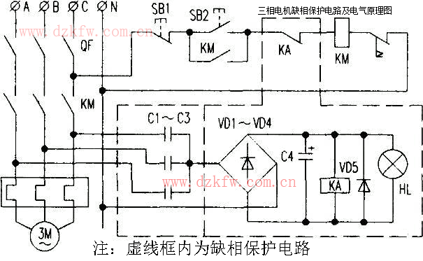 缺相保护电路如图中的虚线框内所示。从三相线路中。