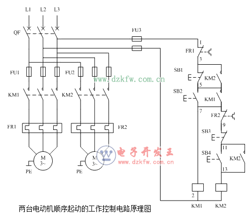 KM2先启动说明KM2的控制电路有电,检查FR2有电,这可能是FR2接点上口的7号线,错接到了FR1上口的3号线位置上了,这就使得KM2不受KM1控制而可以直接启动。