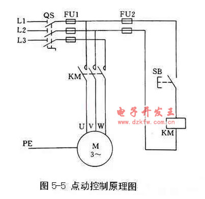 点动控制电路由电源开关QS、熔断器FU、按钮SB、接触器KM和电动机M组成。如图5-4、图5-5所示。
