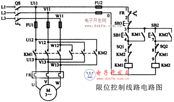 限位控制线路如图所示。从图中可以看出,限位控制线路是在接触器连锁正反转控制线路的正反转控制电路中串接两个行程开关SQ1、SQ2构成。