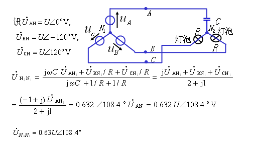 三相电源相序的判定:若以接电容一相为A相,则B相电压比C相电压高。B相灯较亮,C相较暗(正序)。