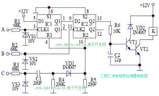 若相序错误,则使得13 脚保持低电平,三极管VT1、VT2 截止,继电器K 的线圈失电,K 的动合触点断开,用电设备停止工作。