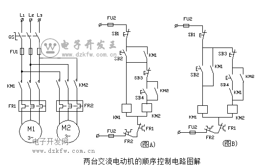 图B:控制电路由KM1线圈电路和KM2线圈电路单独构成。KM1的动合触点作为一控制条件,串接在KM2线圈电路中,只有KM1线圈得电吸合,其辅组助动合触点闭合,此时才能控制KM2线圈电路。停止按钮SB3只能控制M2电动机的停转,停止按钮SB1为全停按钮。本电路只有满足M1电动机先起动的条件,才能起动M2电动机。
