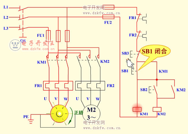 当M1启动后,按下启动按钮 SB2→KM2线圈得电→